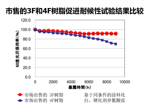 Lumiflon®氟樹脂可以和聚酯進(jìn)行混合,利用Lumiflon®氟樹脂和聚酯的熔融粘度之差,使氟樹脂聚集在最表面,形成了高耐候性的涂膜。與丙烯酸和聚氨酯相比,還是其他氟碳樹脂相比都表現(xiàn)出更高的耐候性。此外它還具有涂料配方及容易涂裝的特點(diǎn),因此Lumiflon®是最適合涂料用的樹脂。